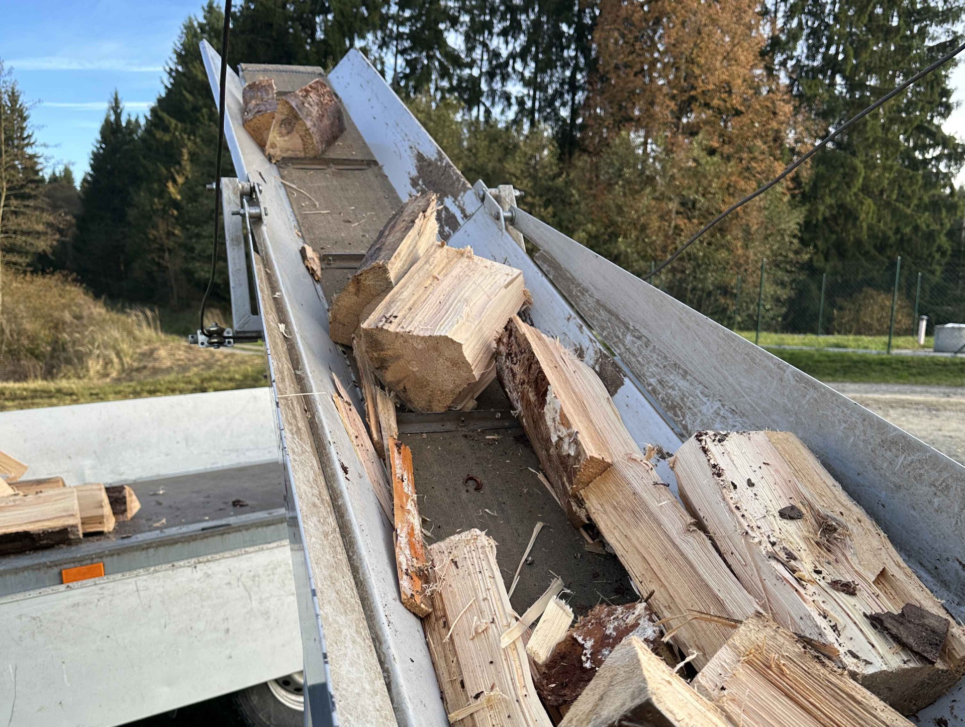 Zpracovaná kláda vstupuje do stroje pomocí řetězového dopravníku. Špalky následně padají z pásového dopravníku rovnou na vozík nebo pod střechu.